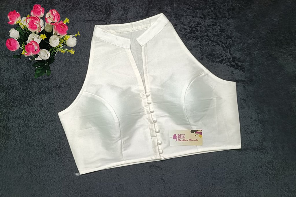 This is a White Color Samo Silk Blouse. This is Halter Neckline in Frontside & High Neckline in Backside with Mandarin Collar. This is a Princess Cut, Padded, Sleeveless Blouse with Front Open. You can team it up with any contrast-colored Traditional/Printed Saree.