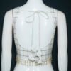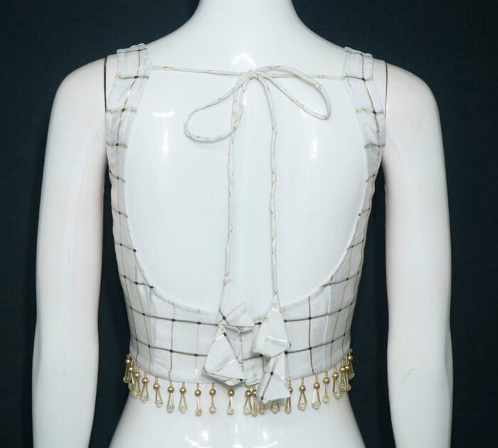 This is a White Color Checks Taffeta Silk Sleeveless Blouse with Lathkan Lace. This Blouse is a Rounded Square Neckline in Frontside and U-Neckline in Backside with Tie-Up. This is a Princess Cut Padded Blouse with Back Open. You can team it up with any contrast colored Traditional Saree.