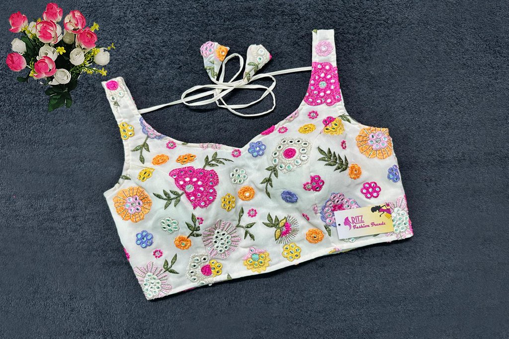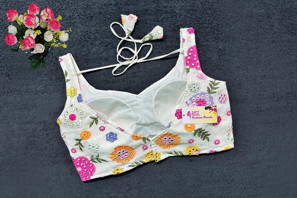 This is a White Multi Color Georgette Embroidered Blouse. This is Leaf Neckline in both Frontside & Backside with Tie-Up. This is a Princess Cut, Padded, Sleeveless Blouse with Back Open. You can team it up with any contrast-colored Traditional/Printed Saree.