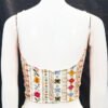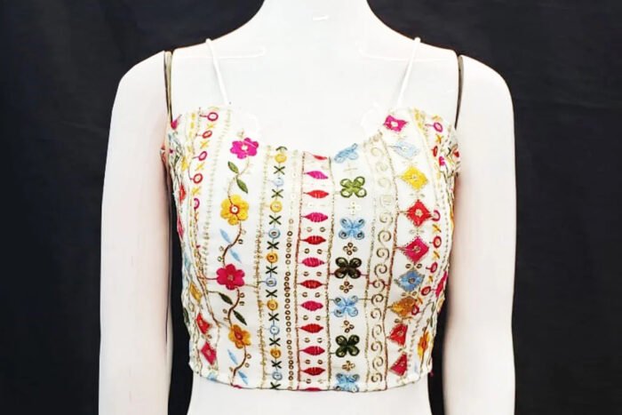 This is a White Multi Color Georgette Heavy Embroidered Spaghetti. This Blouse is Sweet Heart Neckline in Frontside & U-Neckline in Backside. This is a Princess Cut, Padded Blouse. This Blouse is Spaghetti and Back Open. You can team it up with any contrast-colored Traditional/Printed Saree.