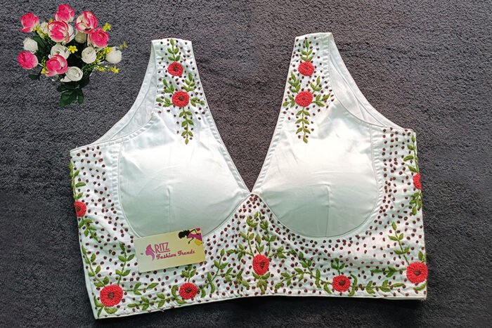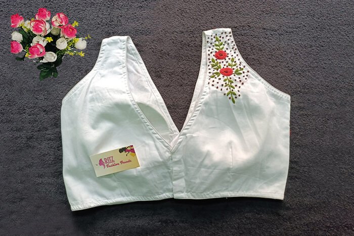 This is a White Multi Color Hand Embroidered Blouse. This Blouse is V-Neckline in both Frontside & Backside. This is a Princess Cut, Padded, Sleeveless Blouse with Back Open. You can team it up with any contrast-colored Traditional/Printed Saree.