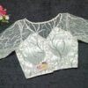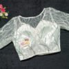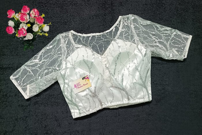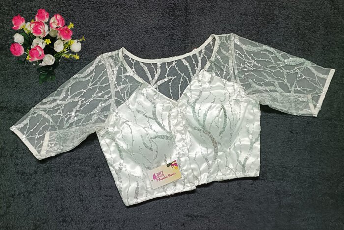 This is a White Color Sequin Net Blouse. This Blouse is V-Neckline in Frontside & Boat Neckline in Backside. This is a Princess Cut, Padded, Glass Sleeve Blouse with Front Open. You can team it up with any contrast-colored Traditional/Printed Saree.