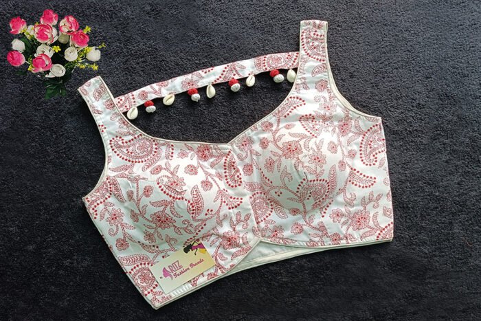 This is a White & Red Color Cotton Printed Blouse. This Blouse is Leaf Neckline in Frontside & U-Neckline in Backside with a Band. This is a Princess Cut, Padded, Sleeveless Blouse with Front Open. You can team it up with any contrast-colored Traditional/Printed Saree.
