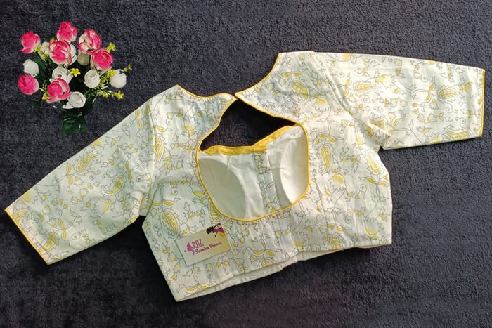 This is a White & Yellow Color Cotton Printed Blouse. This Blouse is Sweetheart Neckline in Frontside & Key-Hole Neckline in Backside. This is a Princess Cut, Padded, Glass Sleeve Blouse with Front Open. You can team it up with any contrast-colored Traditional/Printed Saree.