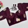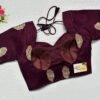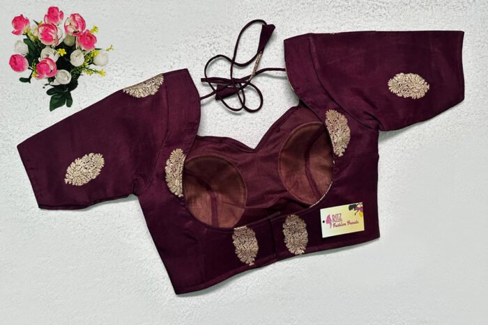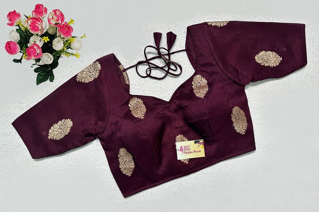 This is a Wine Color Russian Silk Blouse. This is a Sweetheart Neckline Blouse Frontside & U-Neckline in Backside with Tie-Up. This is a Princess Cut, Padded, Glass Sleeve Blouse with Back Open. You can team it up with any contrast-colored Traditional/Printed Saree.