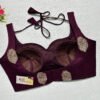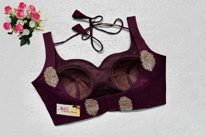 This is a Wine Color Russian Silk Blouse. This is Sweetheart Neckline in Frontside & U-Neckline in Backside with Tie-Up. This is a Princess Cut, Padded, Sleeveless Blouse with Back Open. You can team it up with any contrast-colored Traditional/Printed Saree.