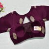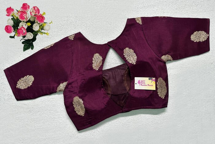 This is a Wine Color Russian Silk Blouse. This is Rounded Neckline in Frontside & Key-Hole Neckline in Backside. This is a Princess Cut, Padded, Glass Sleeve Blouse with Back Open. You can team it up with any contrast-colored Traditional/Printed Saree.