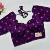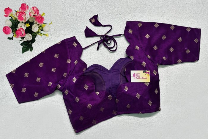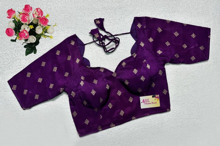 This is a Purple Color Russian Silk Blouse. This is Sweetheart Scallop Neckline in Frontside & Square Scallop Neckline in Backside with Tie-Up. This is a Princess Cut, Padded, Glass Sleeve Blouse with Back Open. You can team it up with any contrast-colored Traditional/Printed Saree.