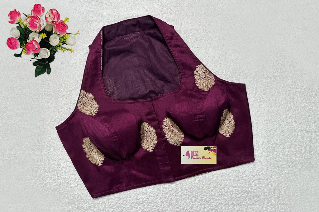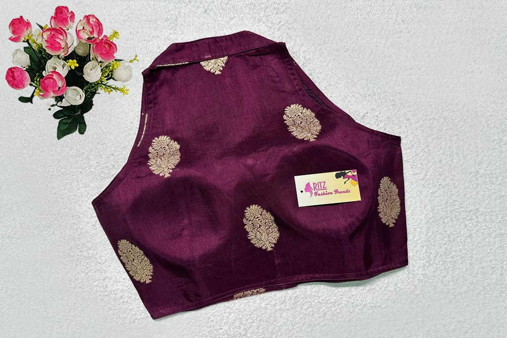 This is a Wine Color Russian Silk Blouse. This is Halter Neckline in Frontside & High Neckline in Backside. This is a Princess Cut, Padded, Sleeveless Blouse with Front Open. You can team it up with any contrast-colored Traditional/Printed Saree.