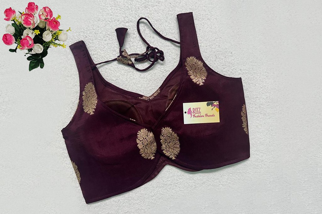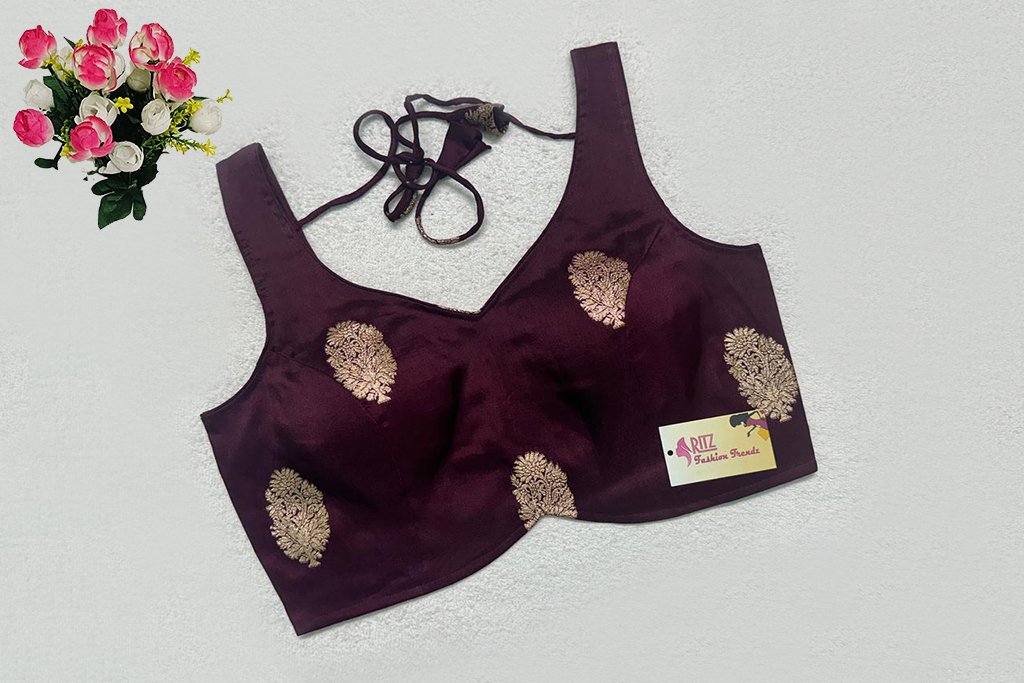 This is a Wine Color Russian Silk Blouse. This is a Leaf Neckline Blouse in both Frontside & Backside with Tie-Up. This is a Princess Cut, Padded, Sleeveless Blouse with Back Open. You can team it up with any contrast-colored Traditional/Printed Saree.