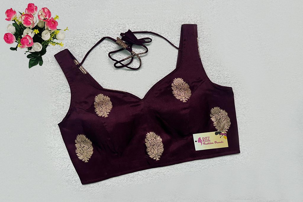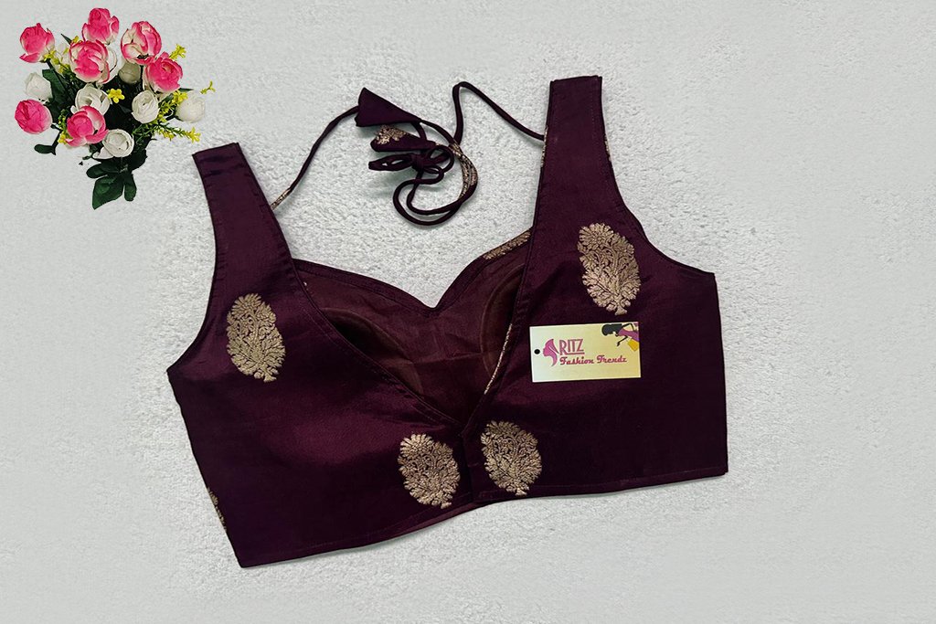 This is a Wine Color Russian Silk Blouse. This is a Sweetheart Neckline Blouse in both Frontside & Backside with Tie-Up. This is a Princess Cut, Padded, Sleeveless Blouse with Back Open. You can team it up with any contrast-colored Traditional/Printed Saree.