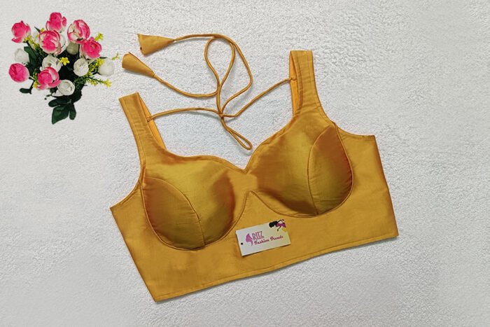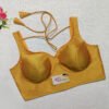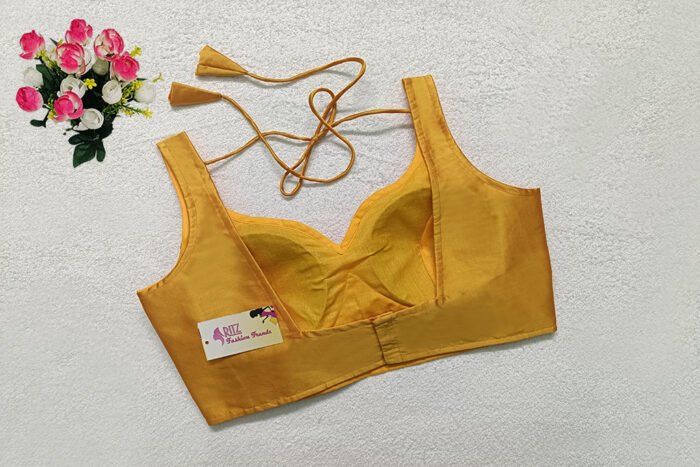 This is a Mustard Yellow Color Samo Silk Blouse. This Blouse is Sweetheart Neckline in Frontside & U-Neckline in Backside with Tie-Up. This is a Princess Cut, Padded, Sleeveless Blouse with Back Open. You can team it up with any contrast-colored Traditional/Printed Saree.