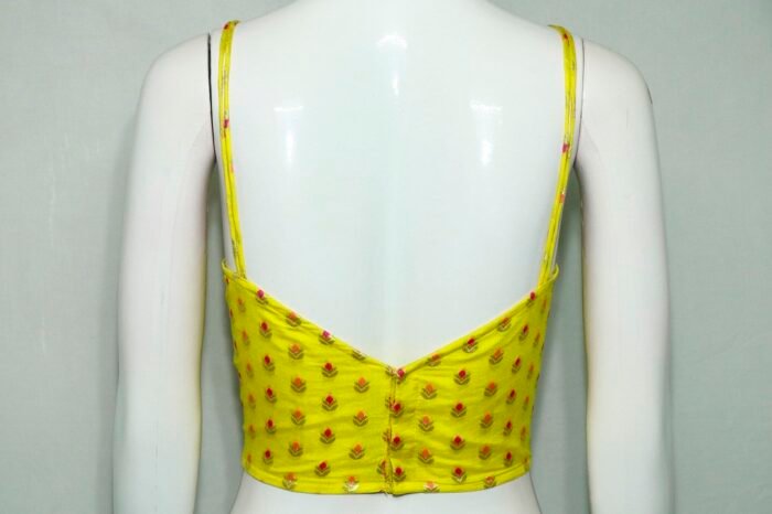This is a Lemon Yellow Multi Color Chanderi Silk Spaghetti. It is a Single Spaghetti Strap Blouse with Sweetheart Neckline in Frontside and V-Neckline in Backside. This is a Princess cut Padded Blouse with Back Open. You can Team it up with any contrast-colored Traditional/Printed Saree. We assure the authenticity and quality of our Products.