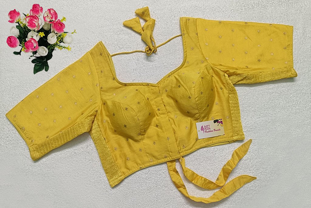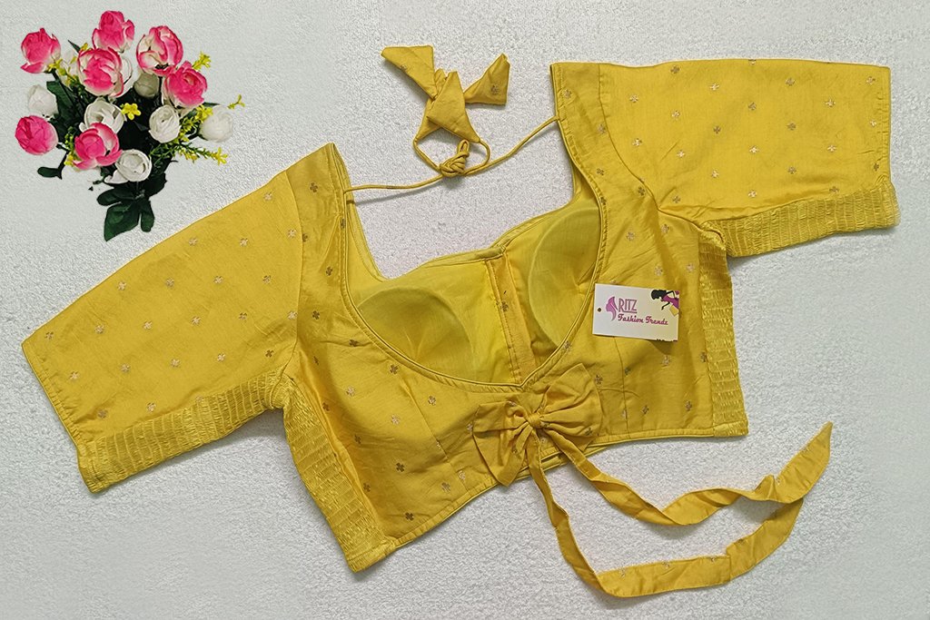 This is a Yellow Color Chanderi Silk Elastic Ease Blouse. This is Sweetheart Neckline in Frontside & Leaf Neckline in Backside with a Bow. This is a Princess Cut, Padded, Glass Sleeve Blouse with Front Open. You can team it up with any contrast-colored Traditional/Printed Saree.