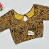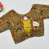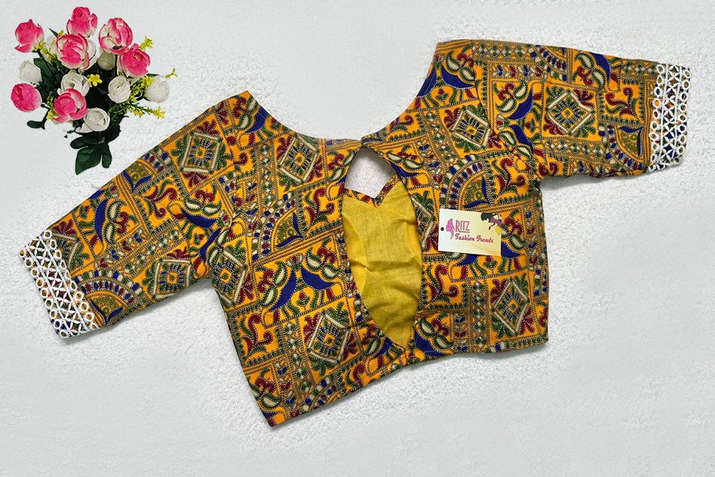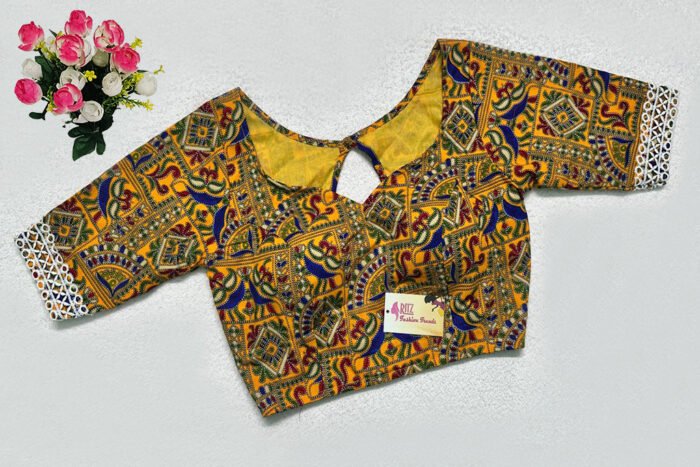 This is a Yellow Multi Color Cotton Printed Blouse. This is a Sweetheart Neckline Blouse in Frontside & Keyhole Neckline in Backside. This is a Princess Cut, Padded, Glass Sleeve Blouse with Back Open. You can team it up with any contrast-colored Traditional/Printed Saree.