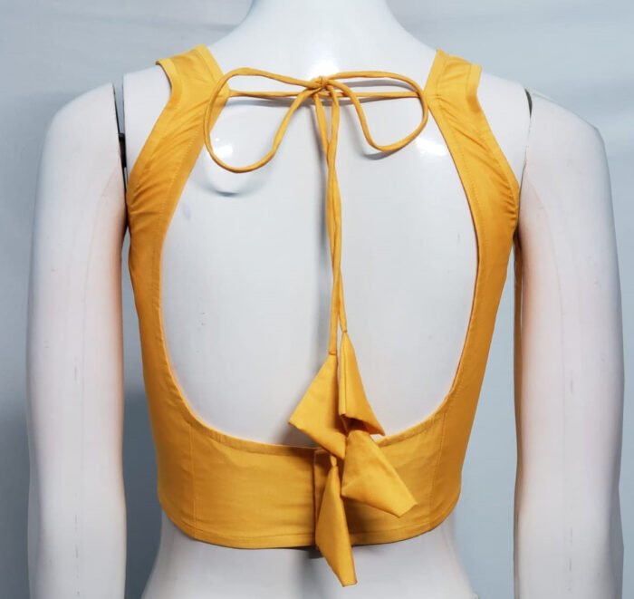 This is a Yellow Color Samo Silk Blouse. This Blouse is Sweet Heart Neckline in Frontside and U-Neckline in Backside with Tie-Up. This is a Princess Cut, Padded, Sleeveless Blouse with Back open. You can team it up with any contrast colored Printed or Traditional Saree.
