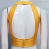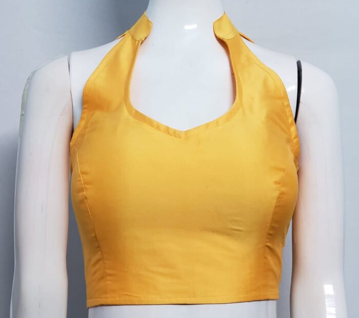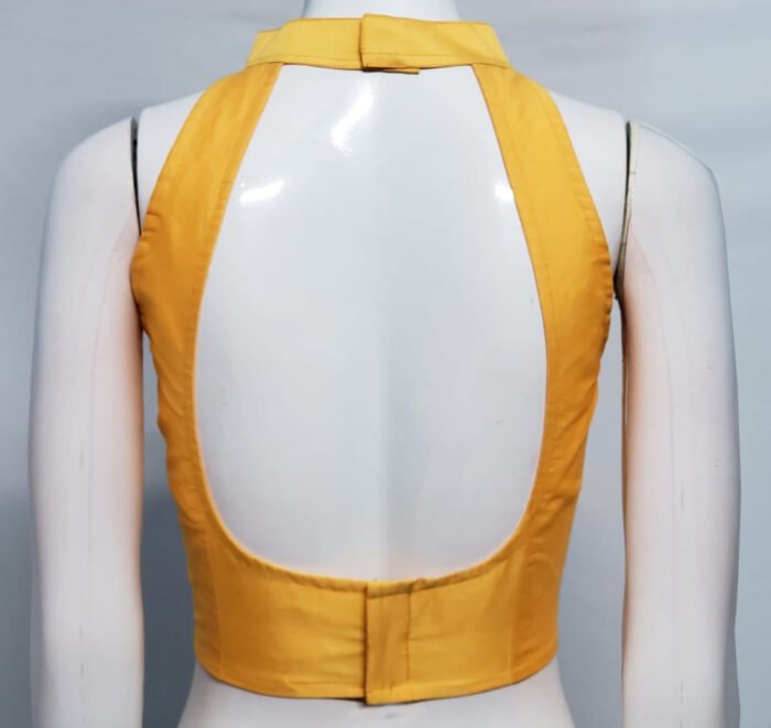 This is a Yellow Color Samo Silk Blouse. This Blouse is Halter Neckline in Frontside and Backside with Mandarin Collar. This is a Princess Cut, Padded, Sleeveless Blouse with Back open. You can team it up with any contrast colored Printed or Traditional Saree.