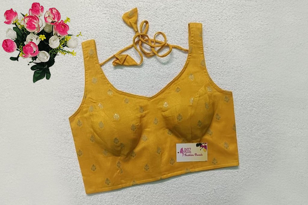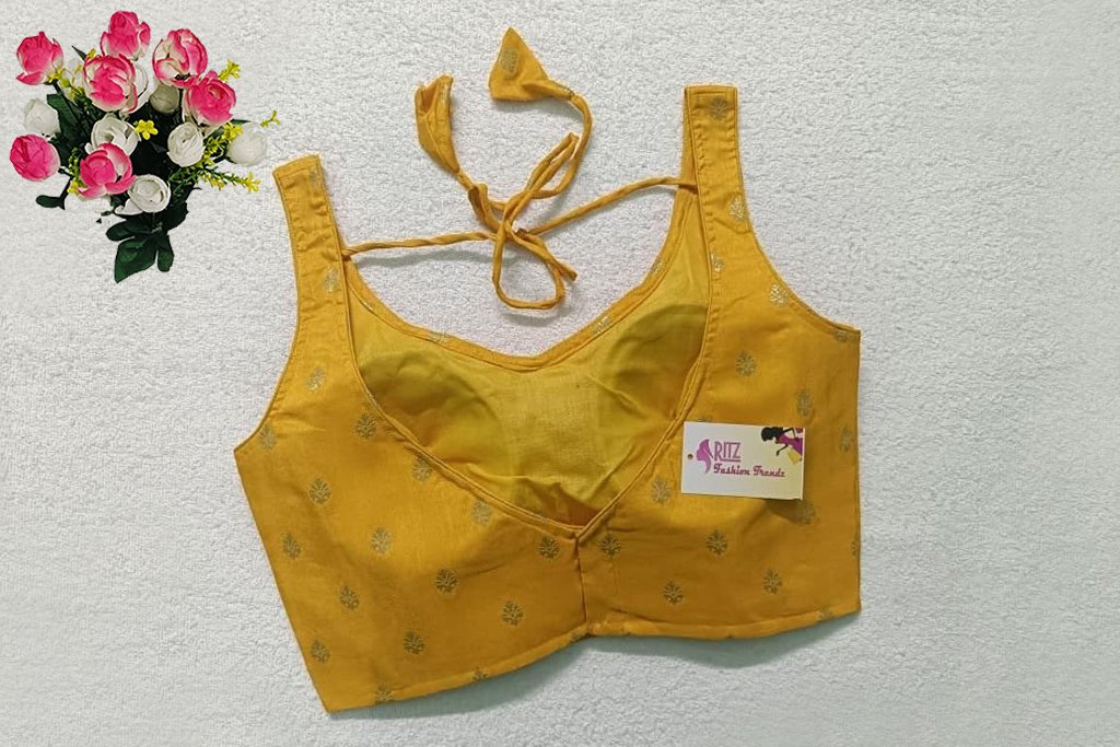 This is a Yellow Color Russian Silk Blouse. This is Leaf Neckline in both Frontside & Backside with Tie-Up. This is a Princess Cut, Padded, Sleeveless Blouse with Back Open. You can team it up with any contrast-colored Traditional/Printed Saree.