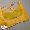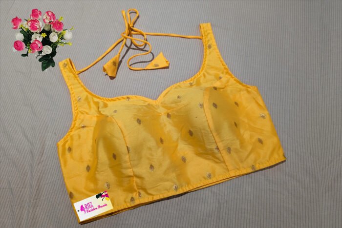 This is a Yellow Color Taffeta Silk Blouse. It is Sweetheart Neckline in Frontside and U-Neckline Backside with Tie-Up. This is a Princess Cut, Padded, Sleeveless Blouse with Back Open. You can team it up with any contrast colored Printed/Traditional Saree.