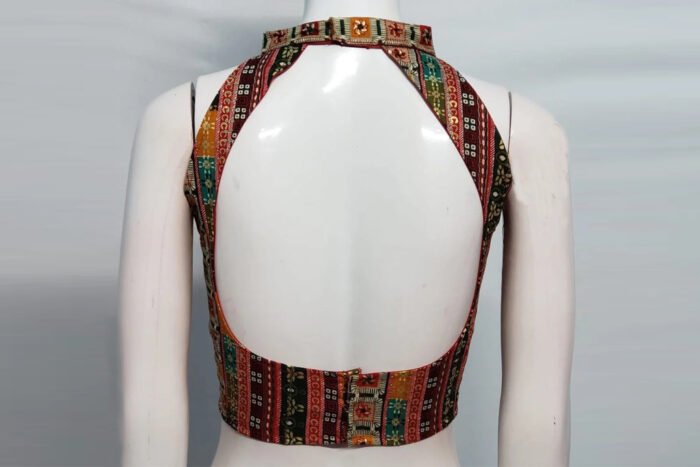 This is a Green Multi Color Rayon Blouse. This Blouse is Halter Arrow Neckline in Both Frontside and Backside with Collar. This is a Princess Cut, Padded & Sleeveless Blouse with Back Open. You can team it up with any contrast colored Printed or Traditional Saree.